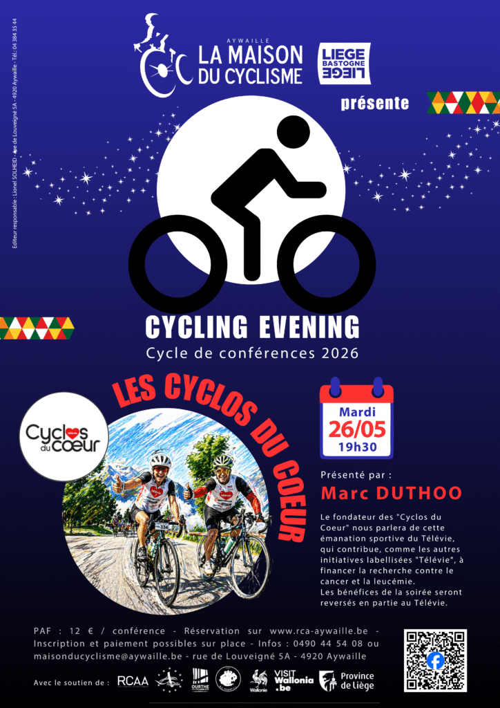 Marc DUTHOO, fondateur des « Cyclos du Coeur« , nous parlera de cette émanation sportive du Télévie, créée en 2007, qui contribue comme les autres initiatives labellisées Télévie, à financer la recherche contre le cancer et la leucémie.